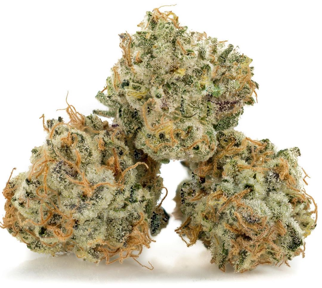 Appearance: Dense, frosty buds with purple hints and orange pistils